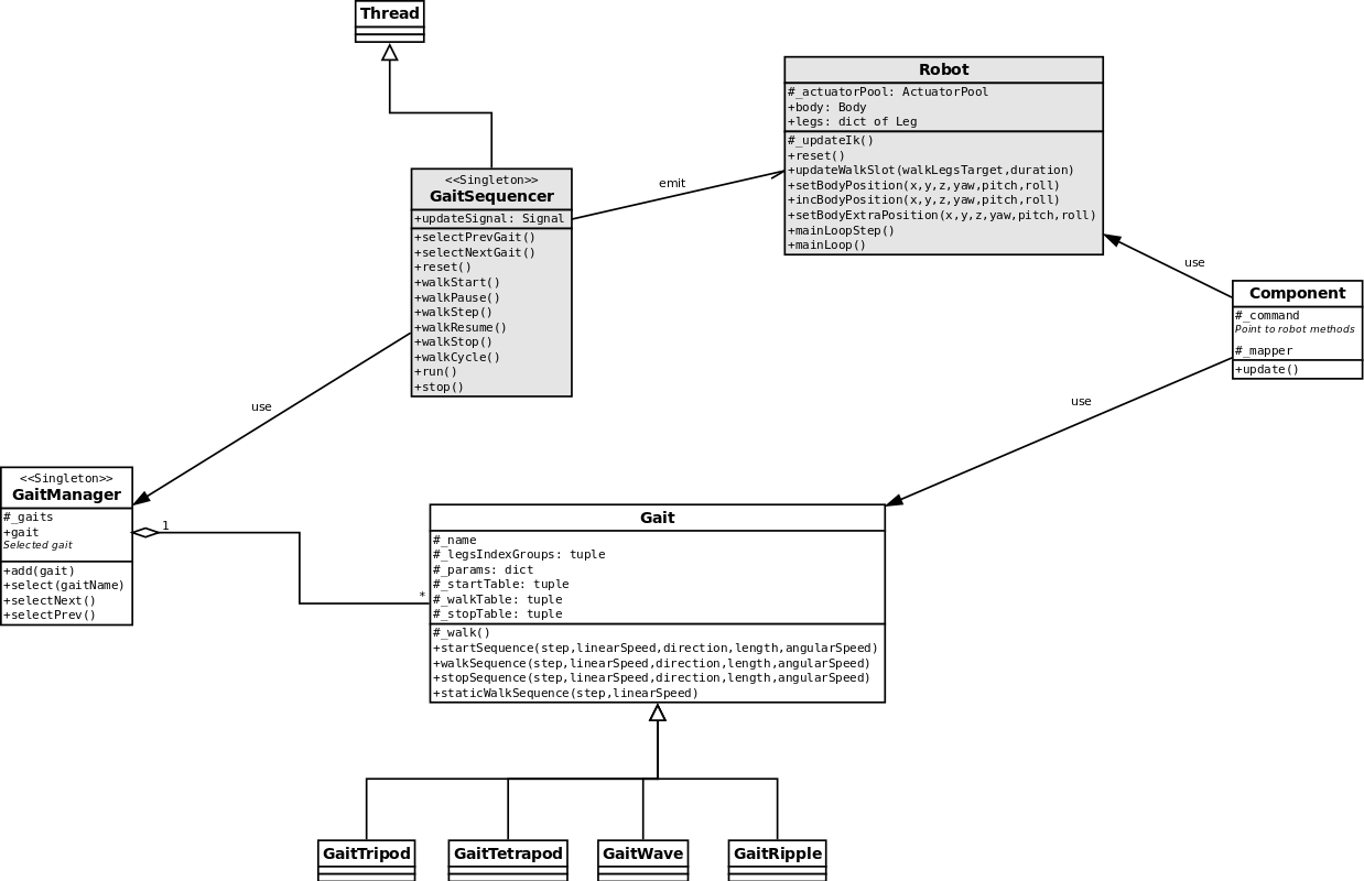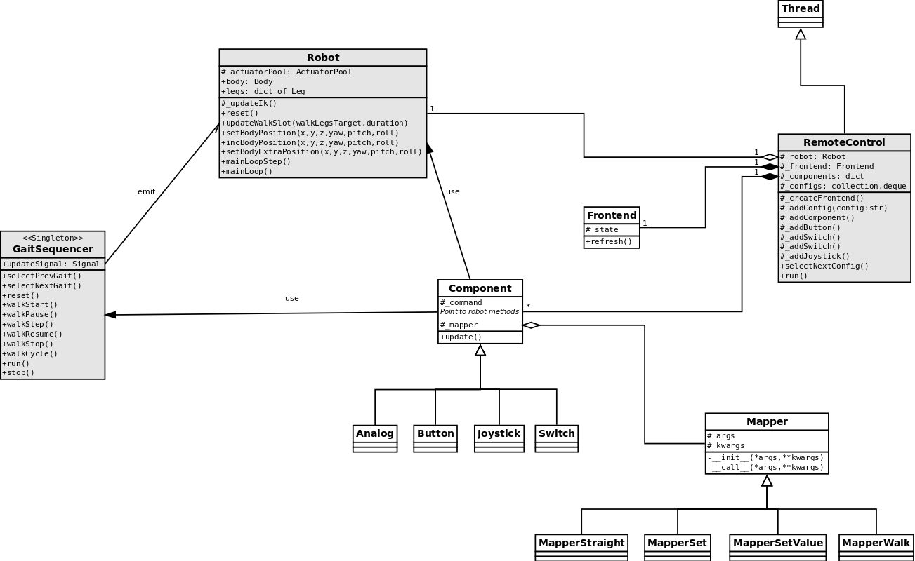 The robot is responsible for all static computation, ie implements the inverse Kinematic. It also manages the body position, which can move along the 3 axes, and rotate around 3 axes.